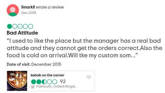 Mark once again feeling slighted, decided to write a negative review on his local kebab shop. Despite this, he often orders from the same place. In later years, allegations of "owing drug money to the turks" apparently have something to do with this place and is yet unconfirmed.