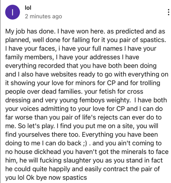The above is an example of a message sent to myself in order to NOT release this website into the mainstream internet, instead of my usual darknet hangouts. I run a webhosting business, and am proficient in SEO of all hat colours. He recently posted a photo of the bottom of the road of a place he believed I live on his main Ghost Adventures of Cornwall YouTube channel he took from Google Maps. There is even evidence he is part of a trolling group, mainly notable in the past was Kriss/Chris Moon, a long debunked paranormal faker. Currently his main are 2 substance abusers Nichola Jones and Wayne Philip Hawes. They will have their own pages in future.