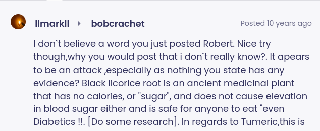 His first claim that "black licorice root has no calories or sugar" is wildly incorrect, as a simple search would show. Somebody who corrected him on his wildly (and potentially dangerous to some) inaccurate statement means he is being attacked. Yet another deflection. You should NEVER take advice on medical information from randoms on the internet and always seek professional help.